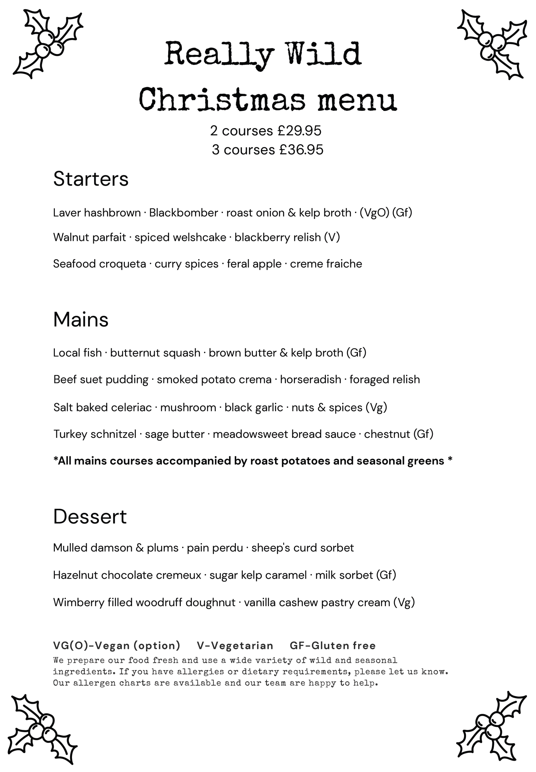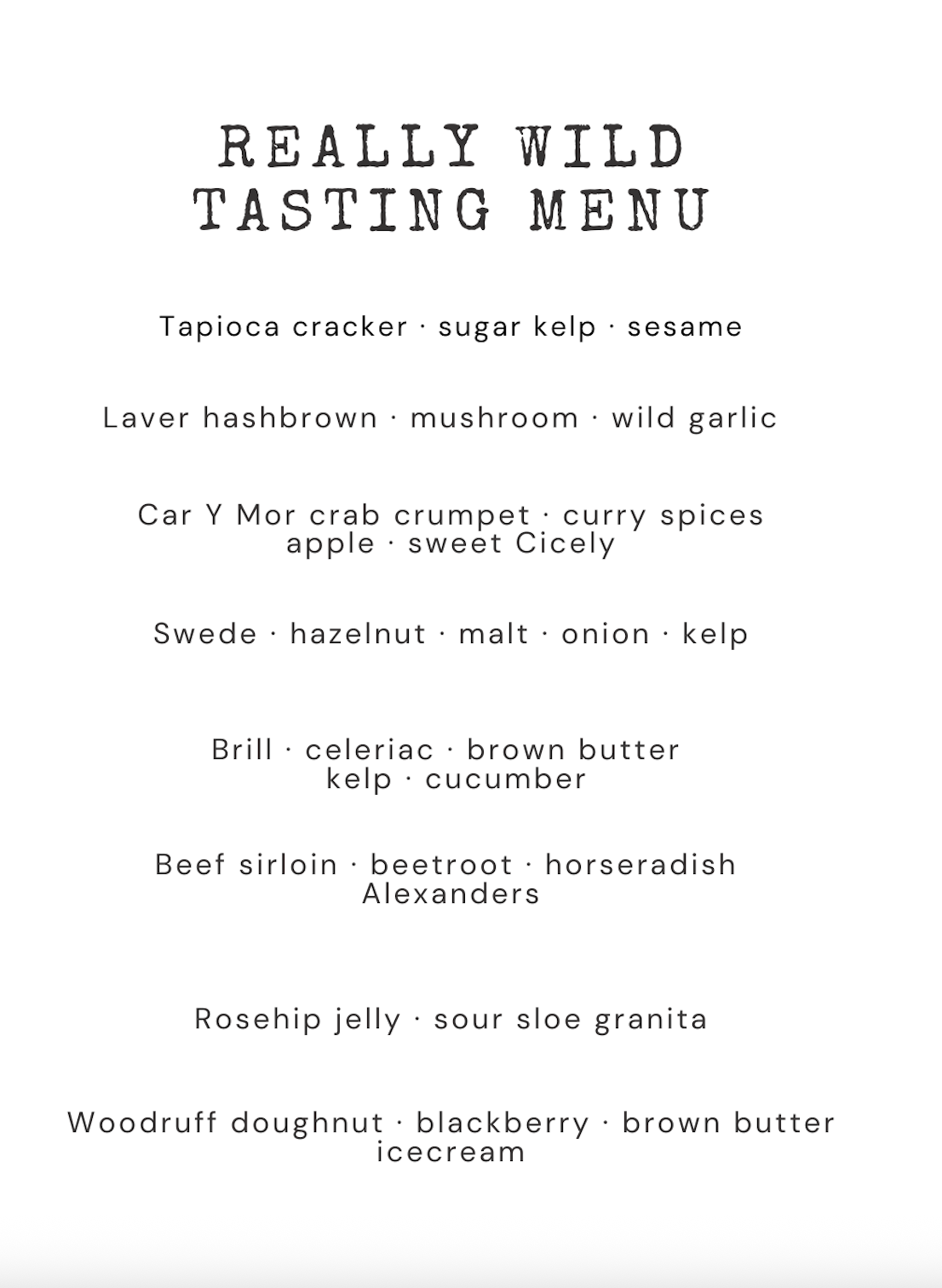 We will be offering a number of different menus throughout the year; every menu is meticulously planned to make the most of the wild and seasonal foods available at the time. We are a growing, independent, local business, having to navigate a difficult economic time for hospitality businesses, so our offerings may vary season to season.